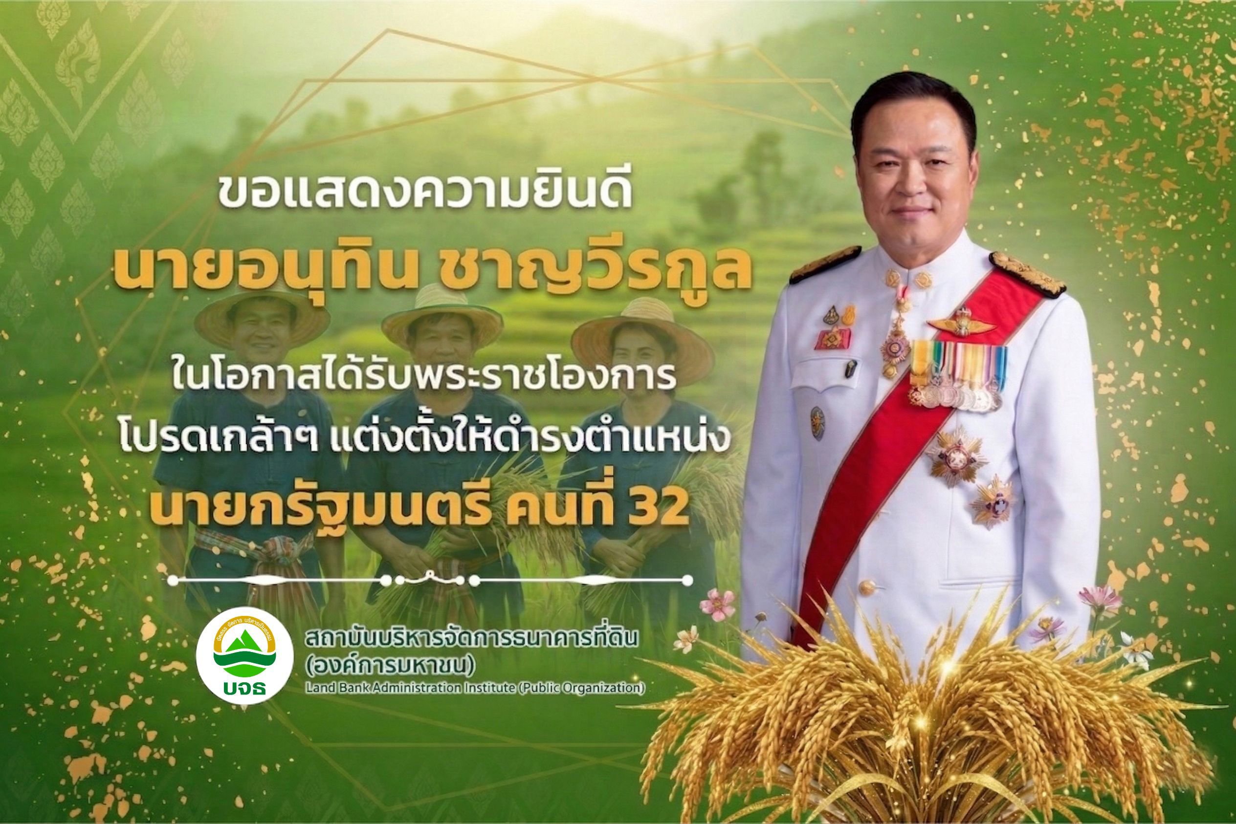 ธนาคารที่ดิน ขอแสดงความยินดี นายอนุทิน ชาญวีรกุล ในโอกาสได้รับพระราชโองการ โปรดเกล้าฯ แต่งตั้งให้ดำรงค์ตำแหน่ง นายกรัฐมนตรี คนที่ 32เมษายน 1, 2026จำนวนผู้เข้าชม : 98
