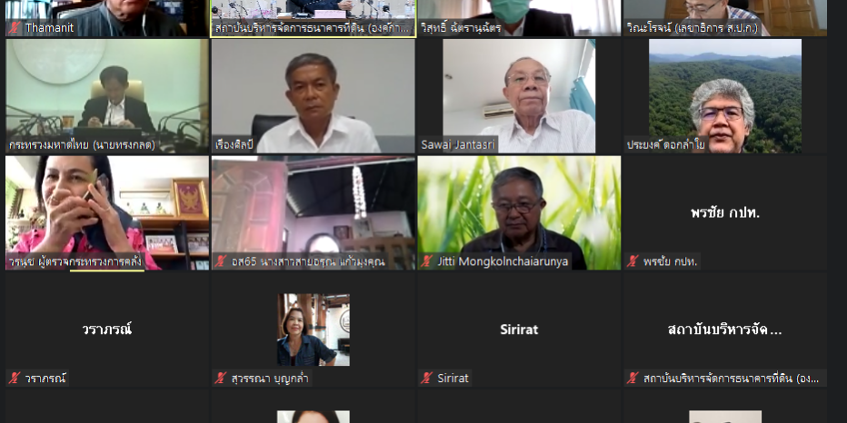 วันที่ 30 กันยายน 2564 ที่ห้องประชุมชั้น 6 สถาบันบริหารจัดการธนาคารที่ดิน (องค์การมหาชน) อาคารเบญจศิริ สถานีวิทยุโทรทัศน์กองทัพบก พล.ต.อ. เฉลิมเกียรติ ศรีวรขาน ประธานคณะกรรมการสถาบันบริหารจัดการธนาคารที่ดิน นายกุลพัชร ภูมิใจอวด ผู้อำนวยการ บจธ. พร้อมด้วยกรรมการ กรรมการผู้ทรงคุณวุฒิ ประธานอนุกรรมการชุดต่างๆ และผู้บริหาร บจธ. ร่วมประชุมครั้งที่ 10/2564 ผ่านการประชุม Video conference Zoom โดยมีวาระสำคัญเพื่อพิจารณา