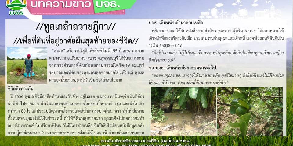 เรื่องราวของครอบครัวเกษตรกรชาว อ. เดิมบางนางบวช จ. สุพรรณบุรี ที่ได้รับผลกระทบจากการบังคับคดี และใกล้จะถูกยึดที่ดิน โดย บจธ. ประสานงานกับภาคีหน่วยงานที่เกี่ยวข้อง เข้ามาช่วยเหลือได้ทันเวลา