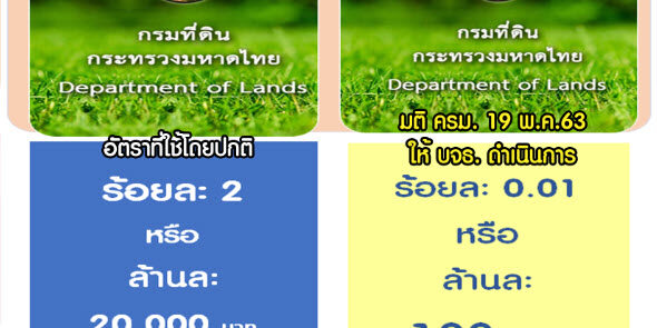 โดยการลดค่าธรรมเนียมจดทะเบียนสิทธิและนิติกรรมในการโอน จากเดิมร้อยละ 2 หรือ ล้านละ 20,000 บาท เป็น ร้อยละ 0.01 หรือ ล้านละ 100 บาท และลดค่าค่าธรรมเนียมการจำนองอสังหาริมทรัพย์ จากเดิมร้อยละ 1 หรือ ล้านละ 10,000 บาท เป็นร้อยละ 0.01 หรือ ล้านละ 100 บาท จากมติคณะรัฐมนตรีดังกล่าวข้างต้น เป็นการช่วยเหลือประชาชนในการลดภาระค่าใช้จ่ายในส่วนค่าธรรมเนียมจดทะเบียนสิทธิและนิติกรรมในการโอน และการจำนองอสังหาริมทรัพย์