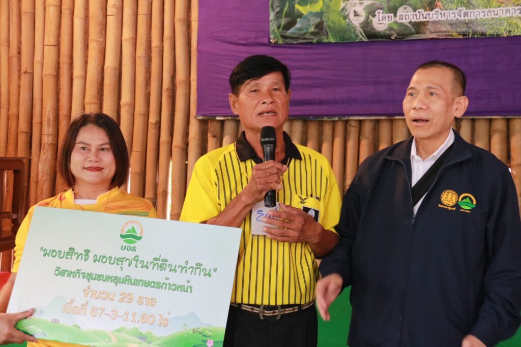 วันที่ 19 พฤษภาคม 2568 พล.ต.อ.เฉลิมเกียรติ ศรีวรขาน ประธานกรรมการสถาบันบริหารจัดการธนาคารที่ดิน เป็นประธานพิธี “มอบสิทธิ มอบสุขในที่ดินทำกิน” พร้อมเปิดฝึกอบรมหลักสูตร “มีที่ทำกิน มีกิน มีใช้ รายได้ยั่งยืน” โดยมีวิสาหกิจชุมชนเกษตรผสมผสานบ้านท่อน ต.โนนท่อน อ.เมือง จ.ขอนแก่น และ วิสาหกิจชุมชนหลุมหินเกษตรก้าวหน้า ต.โคกสูง อ.อุบลรัตน์ จ.ขอนแก่น จำนวน 79 คนเข้ารับการอบรม