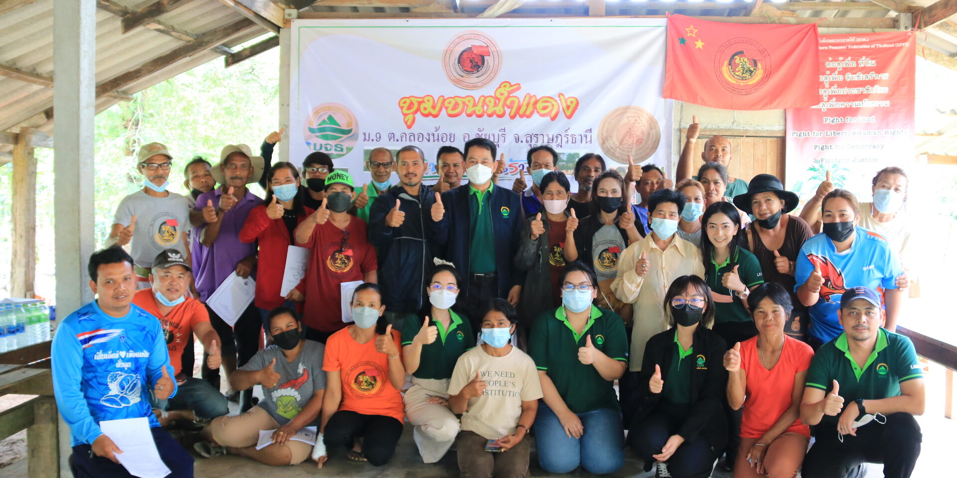 เมื่อวันที่ 26 สิงหาคม 2565 นายกุลพัชร ภูมิใจอวด ผู้อำนวยการ บจธ. นำทีมกองกฎหมายและงานคดี สถาบันบริหารจัดการธนาคารที่ดิน (องค์การมหาชน )จัดเวทีรับฟังความคิดเห็นร่างกฎหมายลำดับรอง 12 ฉบับ ตามร่างพระราชบัญญัติสถาบันบริหารจัดการธนาคารที่ดินและกระจายการถือครองที่ดินอย่างเป็นธรรมและยั่งยืน พ.ศ…..ณ สหกรณ์ การเกษตรสหพันธ์เกษตรกรภาคใต้ ชุมชนน้ำแดงพัฒนา ต.คลองน้อยอ.ชัยบุรี จ.สุราษฎร์ธานี หลังจากนั้น ได้ลงพื้นที่ตรวจเยี่ยมแปลงที่ดินของเกษตรกร ในพื้นที่จำนวน 23 ครัวเรือนพื้นที่ 69 ไร่และร่วมหาแนวทางประสานงานหน่วยงานในท้องถิ่นเพื่อขอรับการสนับสนุน น้ำบาดาล และไฟฟ้า ในพื้นที่ พร้อมให้กำลังใจพี่น้องชาวบ้านขอให้มุ่งมั่นในการทำเกษตร โดย บจธ. จะอยู่เคียงข้างร่วมพัฒนาให้พี่น้องเกษกรต่อไป โดยปัจจุบัน พี่น้องเกษตรกรเข้าทำประโยชน์ โดยกลุ่มฯเช่าซื้อในราคาไร่ละ 65,000 บาทต่อปี เป็นเวลาทั้งหมด 15 ปี ซึ่งนับเป็นความสำเร็จทางนโยบายของชุมชนในการจัดการบริหารที่ดินในรูปแบบกรรมสิทธิ์ร่วม หลังจากที่สมาชิกชุมชนสันติพัฒนาได้ผลักดันในประเด็นนี้มาแล้วกว่า 5 ปี และถูกดำเนินคดีแพ่งและอาญามานับหลายคดีจากการต่อสู้เพื่อให้ได้สิทธิในที่อยู่อาศัยและที่ดินทำกิน หนึ่งในชาวบ้านที่ เคยถูกดำเนินคดีในพื้นที่กล่าวว่า “รู้สึกดีใจอย่างแรงที่ บจธ. เข้ามาช่วยเหลือ ถ้าไม่มี บจธ. ก็ไม่รู้จะอยู่อย่างไร ตอนนี้กลุ่มของเราได้รับการยอมรับจากชุมชนแถวนี้แล้ว มีผลผลิต รายได้เป็นของตนเอง ขอบคุณ บจธ. จริงๆ”