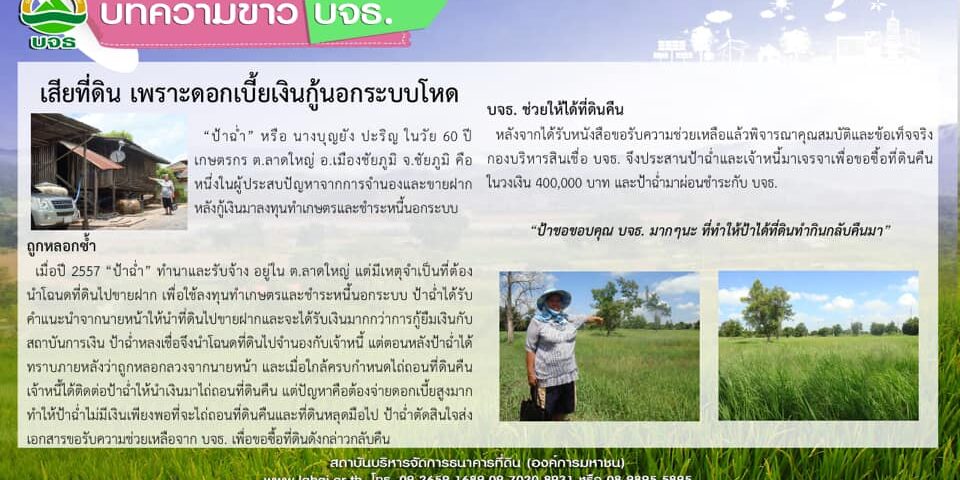 ต.ค.152021ข่าวประชาสัมพันธ์ “ป้าขอขอบคุณ บจธ. มากๆนะ ที่ทำให้ป้าได้ที่ดินทำกินกลับคืนมา” เรื่องของป้าฉ่ำ ชาวนาชัยภูมิที่สูญเสียที่ดินไปแล้ว และได้ที่ดินคืนมาทำกินจนถึงวันนี้ จำนวนผู้เข้าชม : 693 Category: ข่าวประชาสัมพันธ์By Pannarutตุลาคม 15, 2021 Author: Pannarut Post navigationPreviousPrevious post:อนุยุทธศาสตร์ จัดประชุมร่วมกำหนดยุทธศาสตร์และแผนปฏิบัติการระยะ 5 ปี และรายงานผลการดำเนินงานของ บจธ. รอบ 12 เดือนNextNext post:ป้าทิพย์ก็ต้องเสียที่ดินอย่างแน่นอน ถ้าไม่ได้รับความช่วยเหลือจาก บจธ.Related postsธนาคารที่ดิน ขอแสดงความยินดี นายอนุทิน ชาญวีรกุล ในโอกาสได้รับพระราชโองการ โปรดเกล้าฯ แต่งตั้งให้ดำรงค์ตำแหน่ง นายกรัฐมนตรี คนที่ 32เมษายน 1, 2026”ธนาคารที่ดิน“ ร่วมประชุม คณะอนุกรรมการส่งเสริมพัฒนาอาชีพและการตลาด ครั้งที่ 1/2569กุมภาพันธ์ 19, 2026บจธ. ร่วมแสดงความยินดี สคทช.ครบรอบ 5 ปีกุมภาพันธ์ 11, 2026ผอ.ธนาคารที่ดิน นำคณะผู้บริหารและเจ้าหน้าที่ ร่วมพิธีวางพวงมาลาเนื่องใน “วันทหารผ่านศึก” ประจำปี 2569 ณ อนุสาวรีย์ชัยสมรภูมิกุมภาพันธ์ 3, 2026“ธนาคารที่ดิน” ร่วมบำเพ็ญกุศลและทำบุญตักบาตรถวายสมเด็จพระนางเจ้าสิริกิติ์ พระบรมราชินีนาถ พระบรมราชชนนีพันปีหลวง เนื่องในพระราชพิธีทรงบำเพ็ญพระราชกุศลสตมวารและร่วมกิจกรรม “รวมพลังแห่งความภักดี”มกราคม 31, 2026บจธ. เดินหน้าพัฒนาศักยภาพบุคลากร จัดอบรม “การเงิน-การลงทุน และ AI” มุ่งยกระดับประสิทธิภาพการทำงานสู่องค์กรดิจิทัล พร้อมประกาศเจตนารมณ์ขององค์กร ว่าจะไม่ทนต่อการทุจริตทุกรูปแบบ และ(No Gift Policy) ในปีงบประมาณ 2569มกราคม 9, 2026
