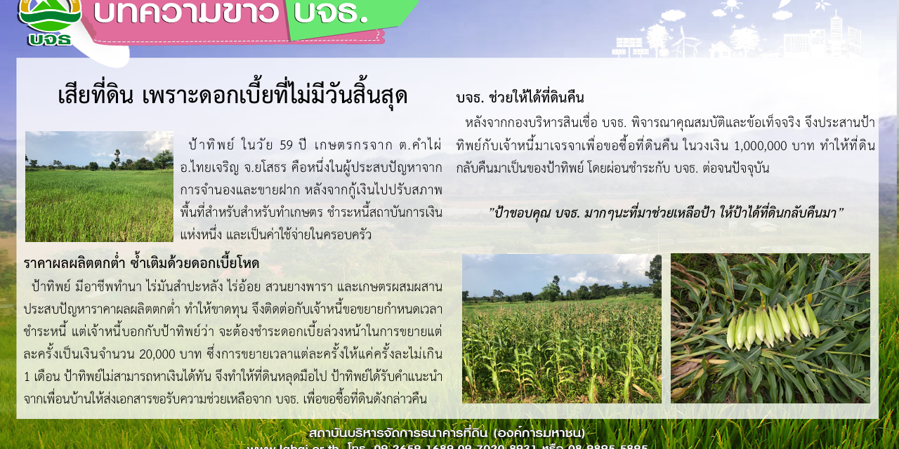 ในช่วงที่ บจธ. ได้รับงบประมาณช่วยเหลือแก้ไขปัญหาการสูญเสียสิทธิในที่ดินระหว่างปี 2559 – 2562 ป้าทิพย์จึงได้รับโอกาสนั้นพอดี ถ้าวันนั้นไม่ได้รับความช่วยเหลือ ป้าทิพย์ก็ต้องเสียที่ดินอย่างแน่นอน