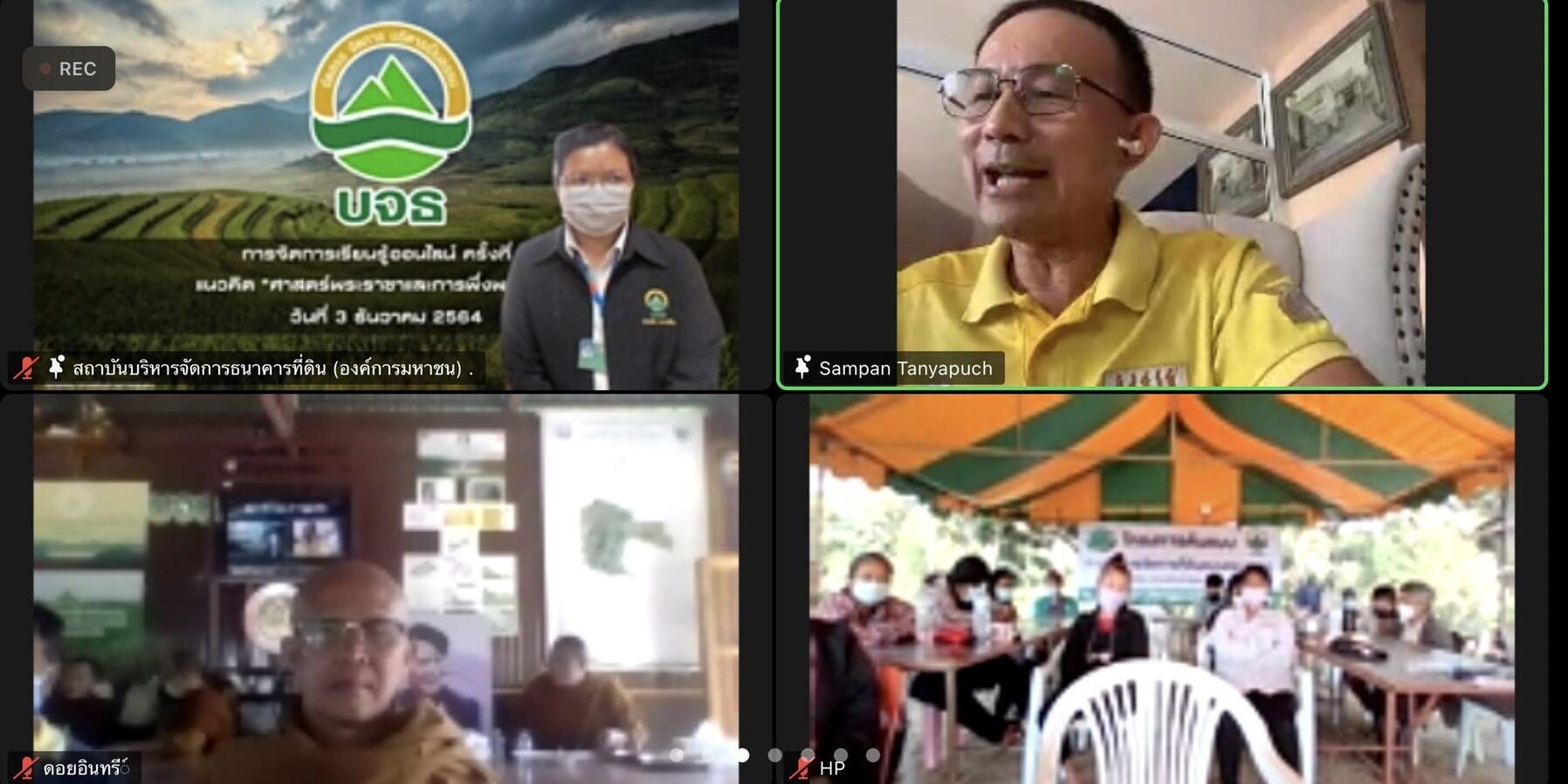 สมาชิกวิสาหกิจชุมชน และสหกรณ์ภายใต้โครงการบริหารจัดการที่ดินอย่างยั่งยืน 12 แห่ง และสมาชิกสหกรณ์ ภายใต้โครงการนำร่องธนาคารที่ดิน 5 ชุมชน ที่ได้รับการสนับสนุนที่ดินทำกินจาก บจธ. เข้าร่วมอบรมแนวคิด “ศาสตร์พระราชาและการพึ่งพาตนเอง” เมื่อวันที่ 3 ธันวาคม 2564 ผ่านแอพพลิเคชั่น zoom ร่วมกับการประชุม ณ สถาบันบริหารจัดการธนาคารที่ดิน อาคารเบญจสิริ สถานีวิทยุโทรทัศน์กองทัพบก โดยมี พ่อคำเดื่อง ภาษี ครูภูมิปัญญาไทย ปราชญ์ชาวบ้าน จ. บุรีรัมย์ ผู้บุกเบิกเกษตรธรรมชาติด้วยทฤษฎีฟางเส้นเดียว และอนุกรรมการส่งเสริมและพัฒนาศักยภาพชุมชน บจธ. รวมทั้งพระอาจารย์วิบูลย์ ธัมมฺเตโช ที่ปรึกษาเจ้าอาวาสวัดพุทธอุทยานดอยอินทรีย์ จ.เชียงราย และอนุกรรมการส่งเสริมและพัฒนาศักยภาพชุมชน บจธ. เป็นวิทยากรบรรยาย เพื่อให้หลักคิด และแนวทางที่ต้องไม่เริ่มต้นโดยเอาเงินเป็นตัวตั้ง หรือเอาความร่ำรวยเป็นจุดเริ่ม แต่ต้องเริ่มลงมือทำทันที ทำจากพื้นที่เล็กๆ ปลูกอะไรที่กินก่อนแล้วค่อยขยายไปเรื่อยๆ ยึดหลักพอมี พอกิน พออยู่