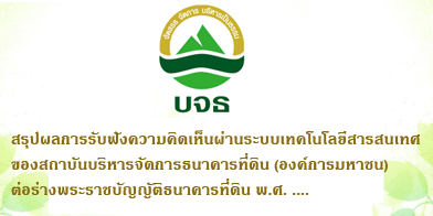 ตามที่ บจธ. ได้ดำเนินการจัดทำการรับฟังความคิดเห็นผ่านระบบเทคโนโลยีสารสนเทศของสถาบันต่อร่างพระราชบัญญัติธนาคารที่ดิน พ.ศ. …. ทางเว็บไซต์ของสถาบันตั้งแต่วันที่ ๘ พฤษภาคม ๒๕๖๐ ถึงวันที่ ๓๑ พฤษภาคม ๒๕๖๐ ตามรัฐธรรมนูญแห่งราชอาณาจักรไทย พุทธศักราช ๒๕๖๐ มาตรา ๗๗ และแนวทางการจัดทำและการเสนอร่างกฎหมายตามบทบัญญัติมาตรา ๗๗ ของรัฐธรรมนูญแห่งราชอาณาจักรไทยตามมติคณะรัฐมนตรีเมื่อวันที่ ๔ เมษายน ๒๕๖๐ นั้น