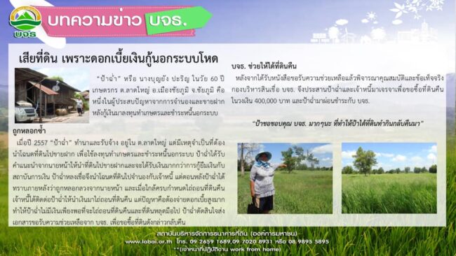 “ป้าขอขอบคุณ บจธ. มากๆนะ ที่ทำให้ป้าได้ที่ดินทำกินกลับคืนมา” เรื่องของป้าฉ่ำ ชาวนาชัยภูมิที่สูญเสียที่ดินไปแล้ว และได้ที่ดินคืนมาทำกินจนถึงวันนี้
